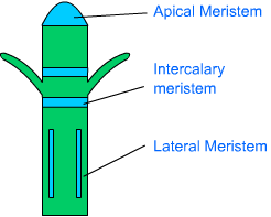 - Apical Meristem:- Apical meristem is present on root apex, stem apex, leaf buds and flower buds. They are responsible for growth in length, i.e. primary growth.