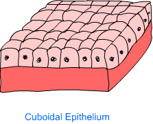 - Cuboidal Epithelium:- The cells are cube-shaped in cuboidal epithelium. Linings of kidney tubules and ducts of salivary glands are composed of cuboidal epithelium. Cuboidal cells provide mechanical support. Cells of epithelium may play the role of secretion and then they are called glandular epithelium.