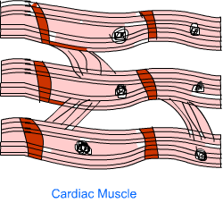 - Cardiac Muscles: The cells of cardiac muscles are in the form of branched fibres. Striations are present and cells are uninucleate. These are found in the heart. Cardiac muscles are capable continuous contraction and relaxation throughout the life.